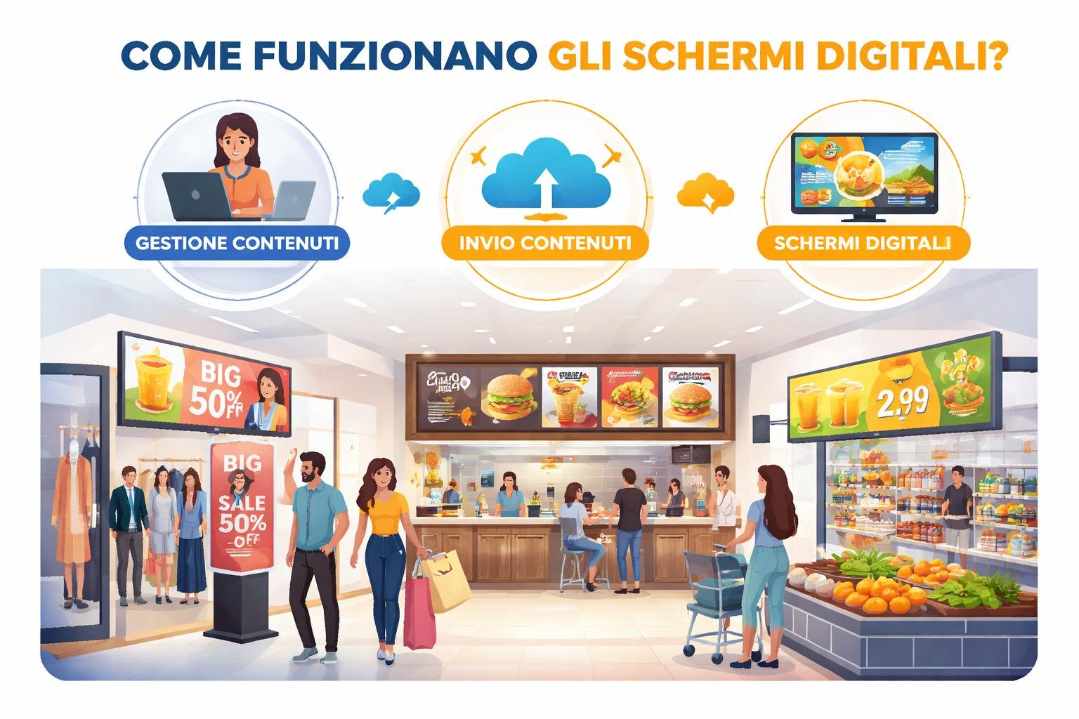 Schermi digitali professionali + contenuti mensili personalizzati + gestione completa